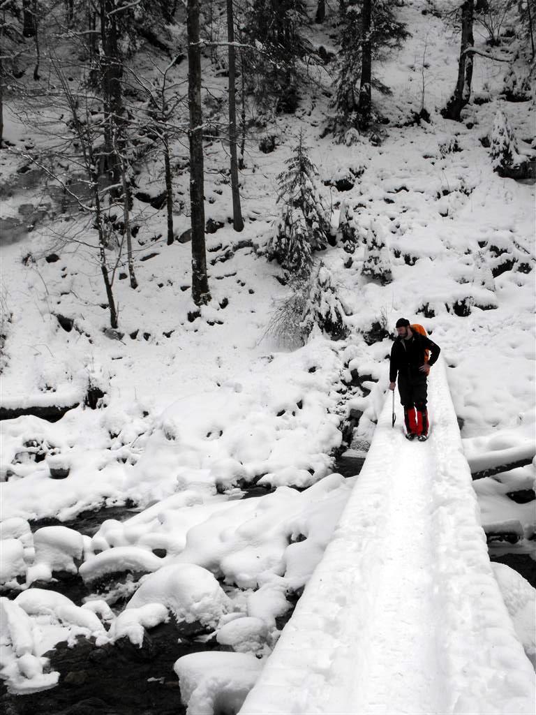 Continuăm spre cabană, un indicator ne informează că am mai avea o oră. Poteca traversează din nou pe partea dreaptă a văii (în urcare) şi apucă mai costiş, întâlnind şi câteva pasaje mai îngheţate care necesitau ceva atenţie sporită.